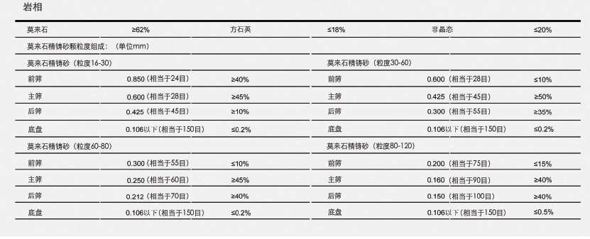 莫來石精鑄砂產(chǎn)品特點(diǎn):1.金剛新材料股份有限公司的子公司山東璞泰礦業(yè)有限公司,坐落于優(yōu)質(zhì)焦寶石產(chǎn)地淄博王村,焦寶石礦品質(zhì)好,白度好;2.莫來石精鑄砂的特點(diǎn)是膨脹系數(shù)小,硬度大(7-8),抗化學(xué)腐蝕性強(qiáng),耐火度高,熱化學(xué)穩(wěn)定性好,耐極冷極熱等特點(diǎn);3.用于精密鑄造的鑄件,易脫殼、不變形、不縮尺、光潔度好、成品率高,產(chǎn)品適用于碳素鋼、不銹鋼、耐熱鋼的復(fù)雜鑄件;4.莫來石精鑄砂規(guī)格有8-16目、10-20目、16-30目、30-60目、60-80目、80-120目,也可根據(jù)客戶的需求定制;5.莫來石精鑄粉規(guī)格有325目,可根據(jù)客戶需求定制。